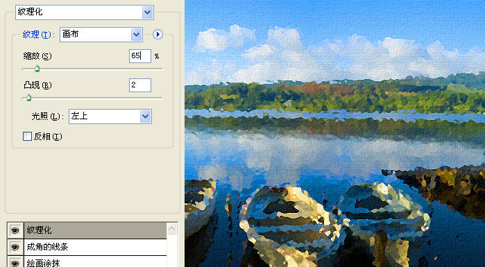 步骤 6、新建最后一个效果图层,选择“纹理 >> 纹理化”滤镜,设置完成后点击确定按钮关闭滤镜库窗口。