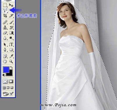 1、打开原图素材,用钢笔或套索工具随意在婚纱范围圈选。