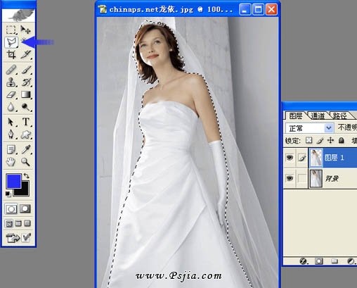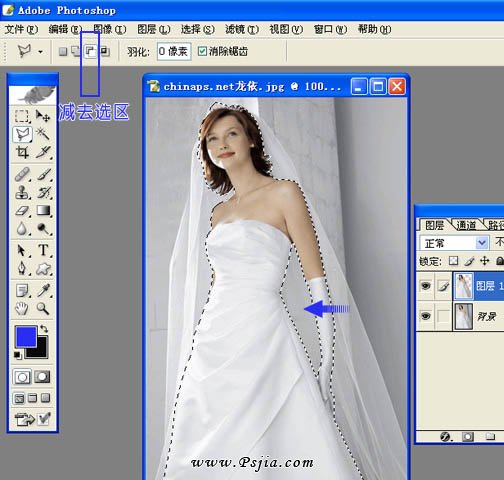 4、用套索工具单独抠出人物部分,如下图。 5、手部空隙处用选择属性面板上的减去选区,然后再扣出来。 6、再适当羽化一下按Ctrl + J 复制到新的图层。
