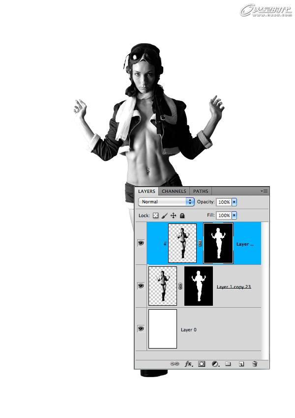 3、复制图层。执行图层>复制图层(模特层),或者按 CMD+J 。然后执行图层>创建剪切蒙版。现在,顶部图层应当有小箭头指向下面的图层。 |