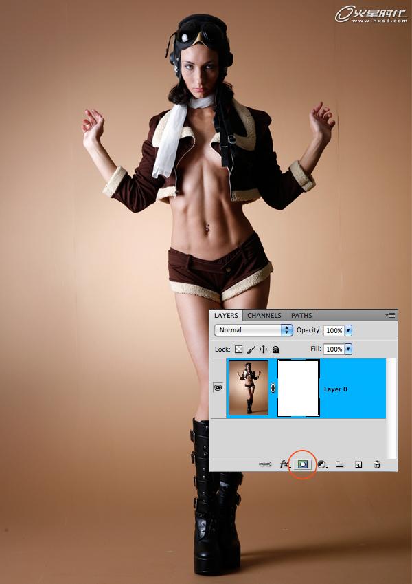 1、对女孩的照片制作蒙版。点击圆圈中按钮,这样,你在照片层中会得到一个白色方块。然后,使用黑色的钢笔工具或画笔工具擦除背景。(请确认你是在白色方块,而不是在照片本身上进行操作。) |