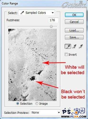 在这一步中,我们需要在人物的头部和手部添加一些冰。打开冰元素的图片,选择→色彩范围,设置颜色容差170,色彩范围是一个很实用的工具,你可以选取相近的色彩。(图04)