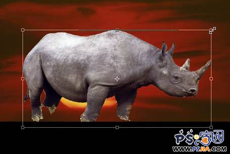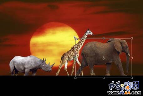 4、将犀牛拖入到画布中,进行自由变换(ctrl+T),调整到适合的大小,同样操作其他两个动物。