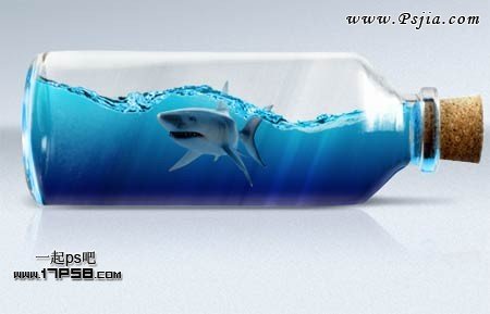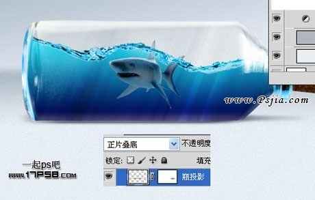 31、下面做出瓶子的投影。底部建新层,调出瓶子选区,填充黑色,ctrl+T压扁,高斯模糊一下,添加蒙版用黑色柔角笔刷去除一部分。 32、合并瓶子和鲨鱼