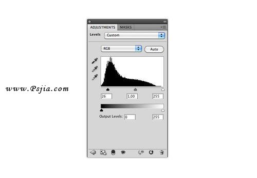 4、再次打开调整菜单,选择色阶,按下面图片将数值分别设为 26 / 1,00 / 255 , 现在纹理的效果就是我们想要的了。