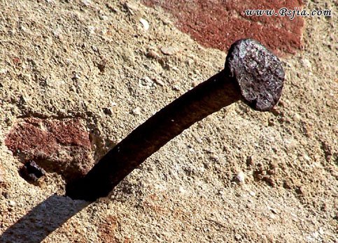 27、打开钉子图片,用套索或钢笔工具将钉子和阴影部分裁剪出来,并将它复制到我们正在做的图片中,ctrl + T按照下图调整位置。