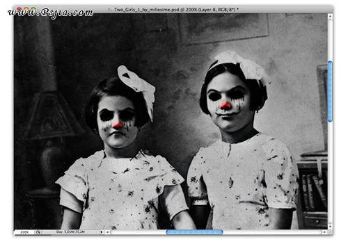 22、ctrl + shift + n创建一个新的图层,用画笔工具沾取黑色在女孩的嘴唇边缘描绘线条,以增强诡异效果。 23、ctrl + shift + n 再创建一个新的图层,用笔刷工