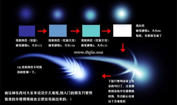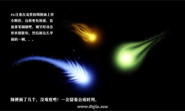 接下来你要换几种颜色尝试一下,黄色、蓝色、绿色的流星,你会发现笔刷的神奇魅力,会出现意想不到的流星效果。不断的实验,才会成功。