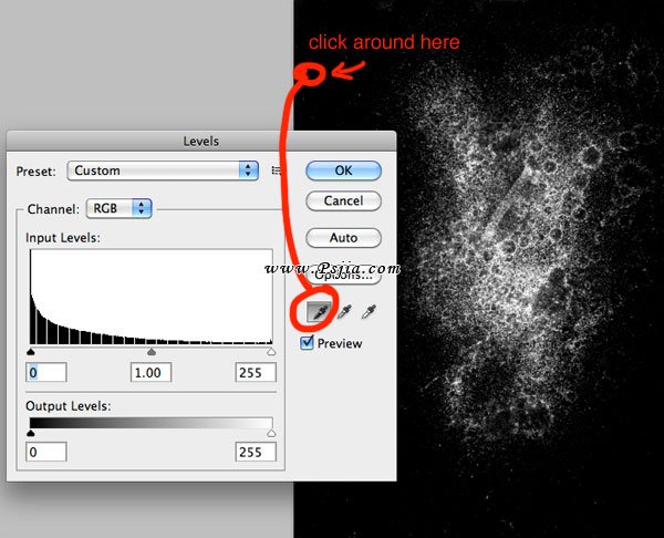15、打开喷溅图片,Ctrl + Shift + U去色。Ctrl + I反转图片颜色。执行图像>调整>色阶,在色阶面板点击黑色吸管,在下图所示的黑色区域取色。