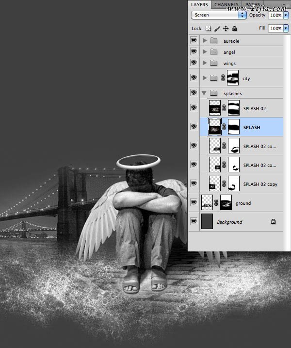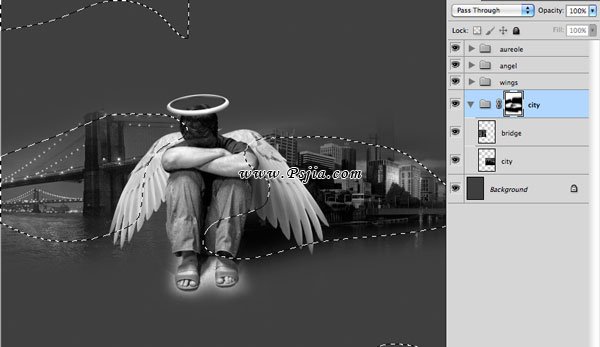 13、之后,将大桥摆在天使和城市身后,如下图所示。将大桥和城市两层打组,并创建蒙版将图片的边缘隐去。