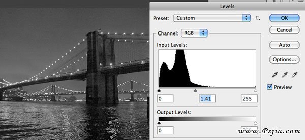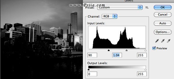 11、打开城市图片,用Ctrl + Shift + U去掉它的颜色。执行图像>调整>色阶,将图像变暗。