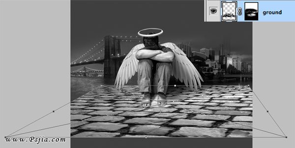 14、现在该制作地面了。打开地面图片并去色。将它按下图所示摆放,创建蒙版隐去边缘。