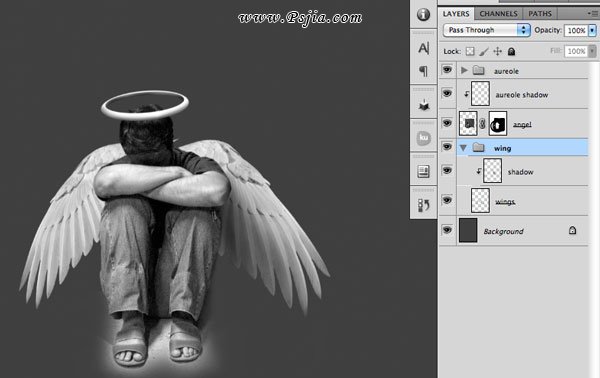 10、新建图层,混合模式设为正片叠底,然后建立一个剪贴蒙版。用黑色的软笔刷(B)在天使的翅膀上画一些阴影。别忘了"Wings"和"Shadow"两层打成一组。