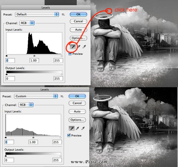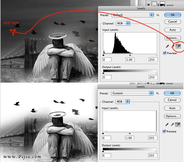 20、打开飞鸟图片。去色后执行图像>调整>色阶,在色阶面板点击白色吸管,在下图所示的区域取色。