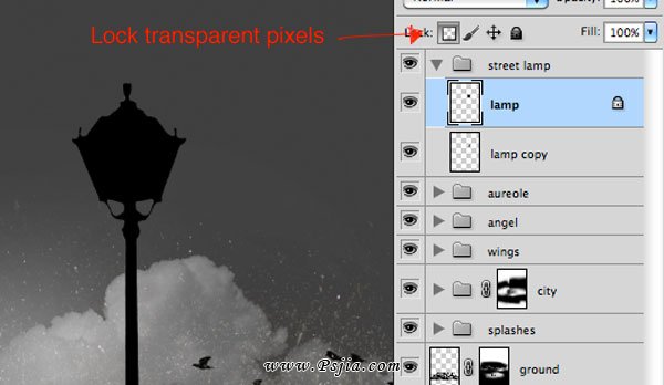 22、打开街灯图片,将它从背景抠出。把它放到所有图层之上。现在我们制作阴影。复制街灯,设置前景色为黑色,锁定图层的透明像素后填充黑色。
