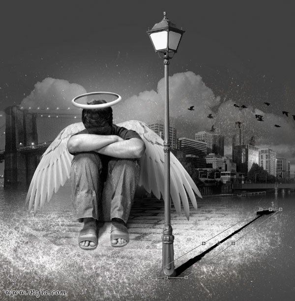 23、使用自由变换工具Ctrl + T调整街灯的阴影。设置混合模式为叠加,不透明度50%,把它放到街灯图层的后面。