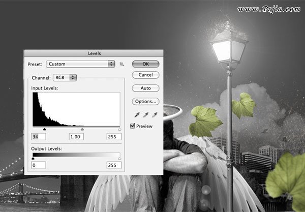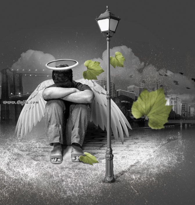 27、复制叶子图层三次,将它们摆在场景的四周。用减淡工具(O)将叶子的一些区域提亮一点。别忘了给天使脚部的叶子加一些阴影,方法和给街灯加阴影是一样的。