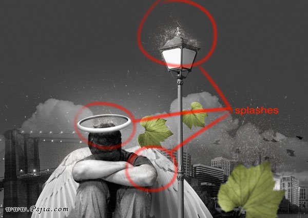 28、使用之前在地面上用过的喷溅图片,把它们摆在天使的头部和路灯之上。以后我们会创建暴雨,所以那些地方应该有雨水溅起的样子。