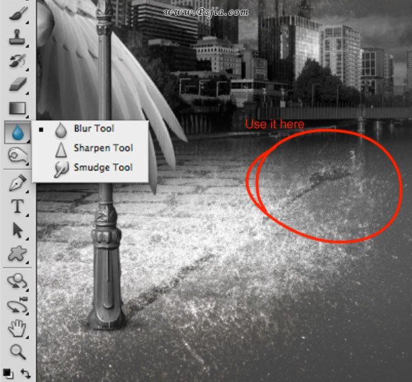 24、取消阴影图层的锁定透明像素选项,对阴影的后部使用模糊工具。