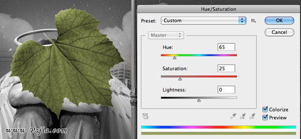 26、现在我们为合成加入落叶。打开叶子图像,将叶子从白背景中抠出(我用的是色彩范围的方式),然后执行图像>调整>色相/饱和度,参数如下。