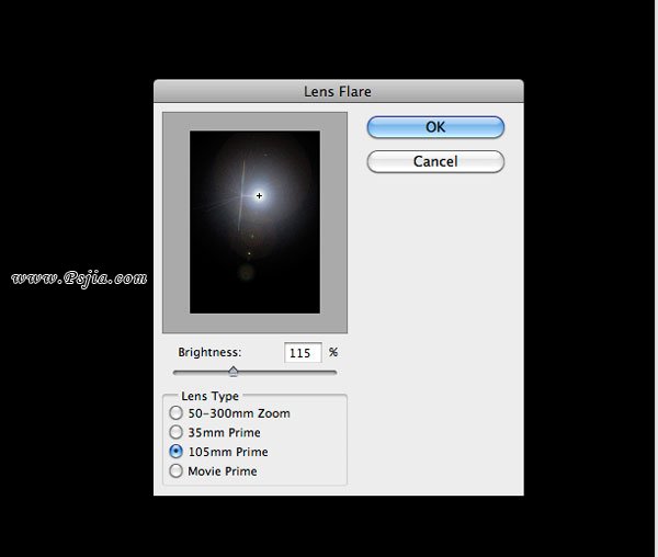 29、现在该为路灯做一些镜头光晕效果了。新建一层填充黑色。执行滤镜>渲染>镜头光晕,参数如下。
