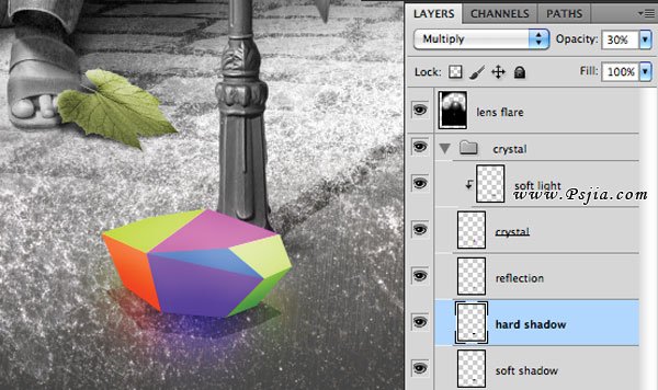32、复制水晶图层,把它放到原图层下方制作反射。混合模式设为线性减淡,不透明度50%,执行滤镜>模糊>高斯模糊,半径35像素。之后在水晶下制作硬阴影(混合模式正片叠底,不透明度30%)和软阴影(混合模式正片叠底,不透明度80%)。