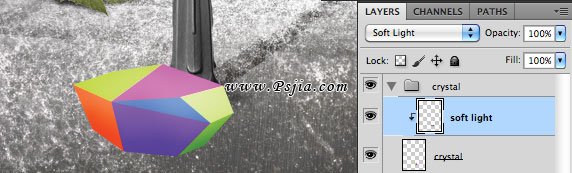 31、打开AI创建一个彩色水晶。创建完后复制到PS中。新建一层,混合模式为柔光,右键创建剪贴蒙版。用一个软笔刷(B),用黑色(变暗)或白色(提亮)水晶的某些区域。这个技术非常实用,尤其是在你不喜欢用加深减淡工具的情况下,因为这种方法可以让你在任何需要的时候修正错误,非常灵活。