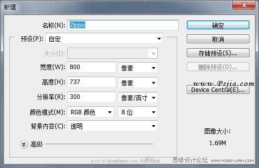 1、创建一个800px*737px .分辨率为300 像素/英寸的新RGB画布,背景选择透明,如图。 |