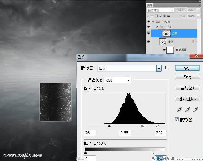 图层-创建剪贴蒙版 .并将“纹理”图层模式设置为:颜色减淡,不透明度设置为85%.然后点击菜单栏: 图像 – 调整- 去色[Shift+ctrl+U]. 然后使用色阶命令 [CTRL+L] . 根据你的实际情况而定,直到你觉得满意为止。这一步完成之后你将得到以下类似效果。