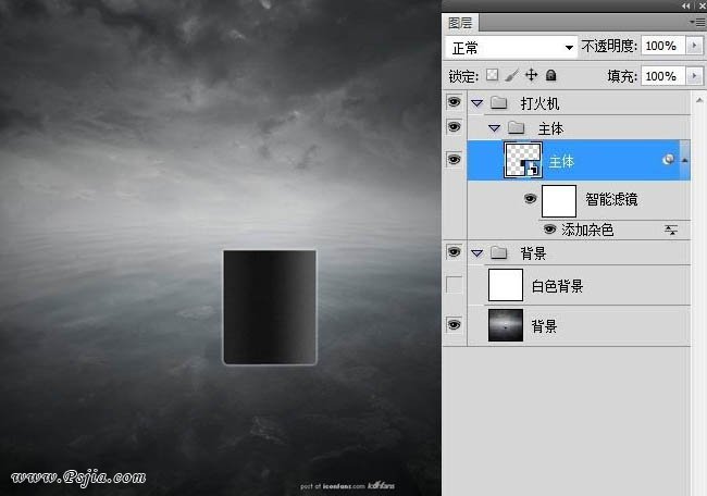 3、我们现在需要使用钢笔工具绘制一个打火机。新建一个图层组将其命名为“打火机”,然后再在“打火机”图层组下面新建一个图层组,将其命名为“机身”不用担心剩下的背景细节 – 我们将在绘制完“打火机”以后处理它。首先我们将绘制打火机的主体,这里我们使用的是钢笔工具。颜色为黑色,添加图层样式:外发光. 渐变叠加。
