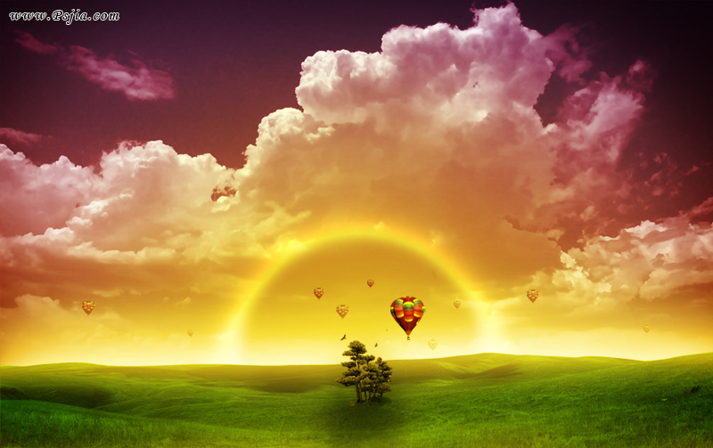 NO.4:利用径向渐变做一个彩虹的效果,给人一种太阳下山余辉的感觉,调节好透明度以及色彩平衡图层混合模式(图片四)
