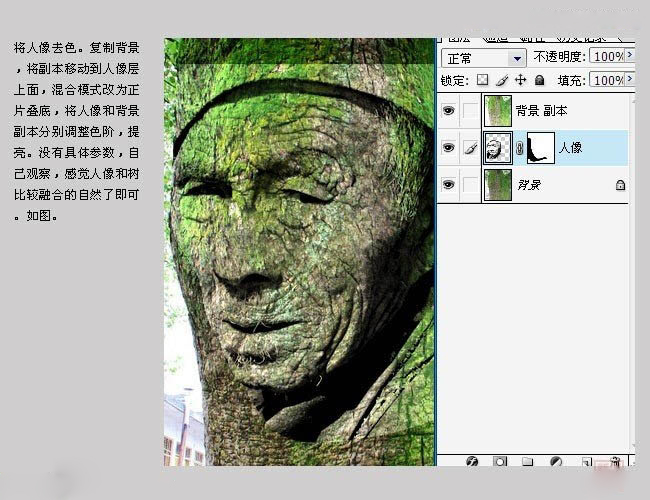 本教程介绍一种比较常用的合成方法,把人像合成到实物里面。这里选择的是古树,其实其它实物的操作过程也是类似的。大致过程:找好相应的素材,把人像去色,用蒙版控制好区域。然后把背景覆盖到人像上面,修改图层混合模式,就可以得到初步的效果。后期处理细节即可。