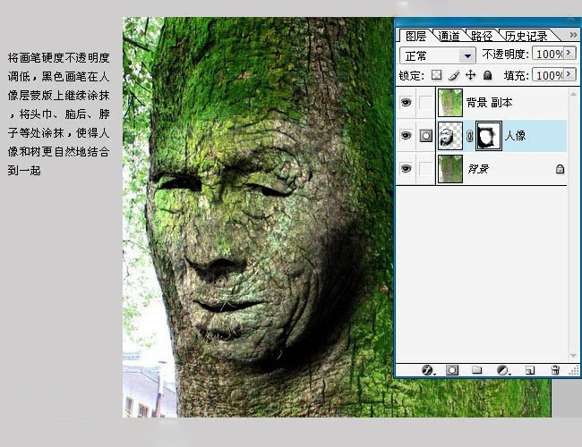 3、将画笔硬度,不透明度降低,用黑色画笔在人像层蒙版上继续涂抹,将头巾、脑后、脖子等处涂抹,使人像和树更自然地结合到一起。 4、右脸颧骨处和