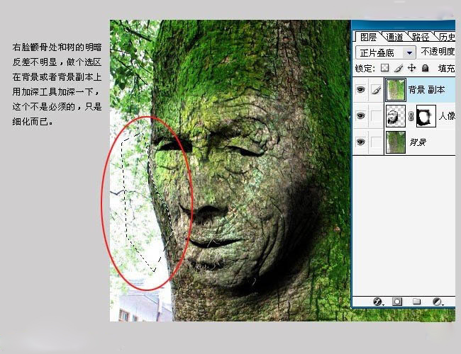 | 4、右脸颧骨处和树的明暗反差不明显,做个选区在背景或背景副本上,用加深工具加深一下,这个不是必须的,只是细化而已。 |