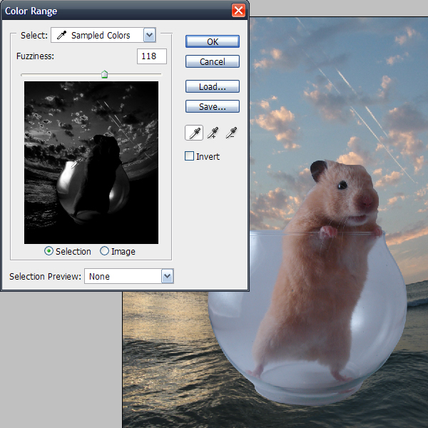 转到编辑/颜色范围,然后单击“上最轻的彩色图像(在玻璃上的亮点)。安排的模糊值,如下面的图片中。