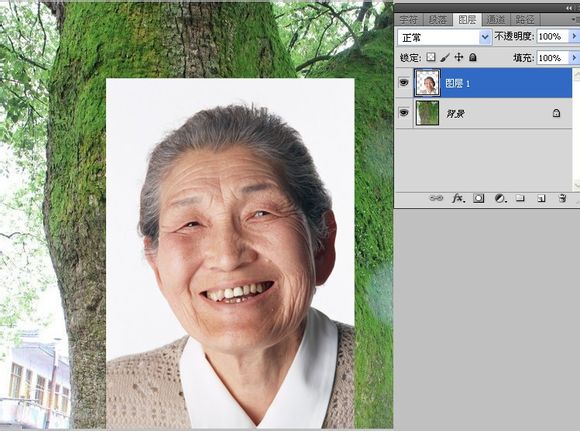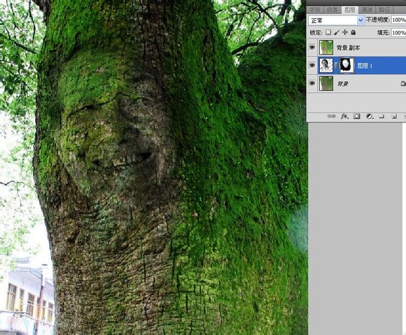 4、4.将画笔硬度,不透明度降低,用黑色画笔在人像层蒙版上继续涂抹,将上部分头发、脑后、脖子等处涂抹,使人像和树更自然地结合到一起。