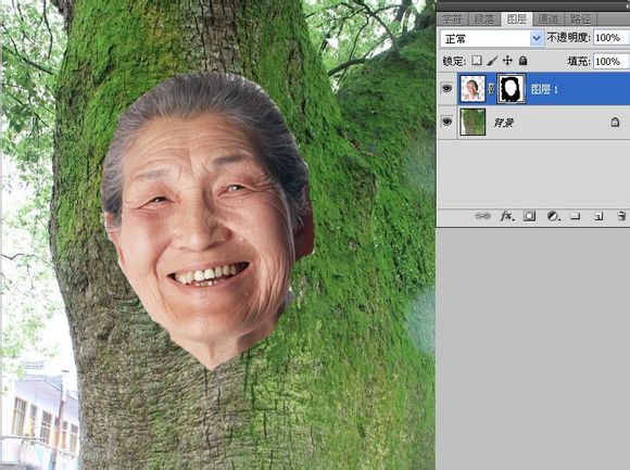 2、给人像图层添加蒙版,用黑色画笔涂抹,擦出脸的边缘,这个不用太准确,差不多即可。