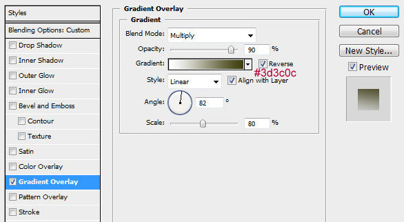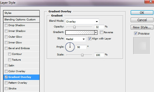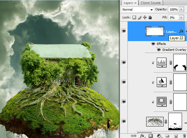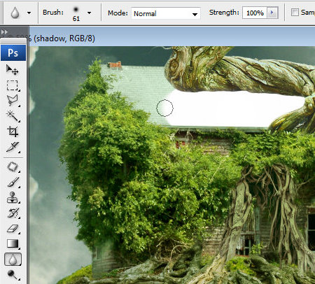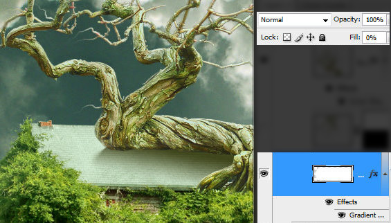 为了给屋顶添加阴影,我们在”树”图层下方创建一个图层,并且画上如下图中的形状,然后使用涂抹工具加工左边边缘。将填充设置为0,然后添加渐变叠加的图层样式。