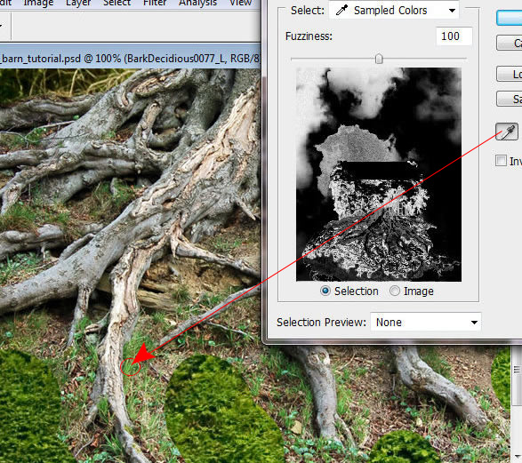 为”根”图层添加蒙版,使根图层的缩略图保持选中状态,执行 选择 > 色彩范围 ,接着使用取色吸管工具点一下下图中圈中的绿色的位置,然后确定。你会得到如下图中的那样的选区。