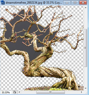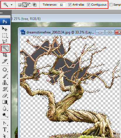打开”树”的素材图片,解开背景的锁,使用魔棒工具 选出图片的背景选区,并将其删除掉。接着使用橡皮擦工具抹除图片的底部。