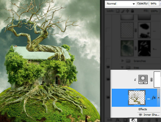 将背景透明的”树”图层放到所有图层之上,把不透明度设置为94%,添加调整图层”可选颜色”,并且添加上内阴影的图层样式。