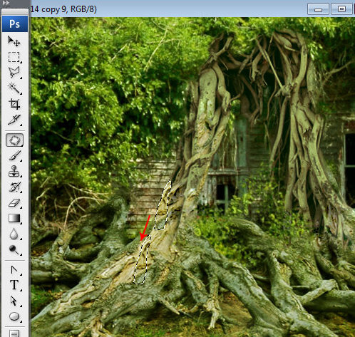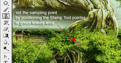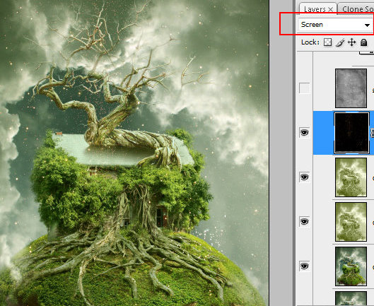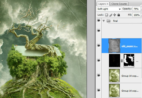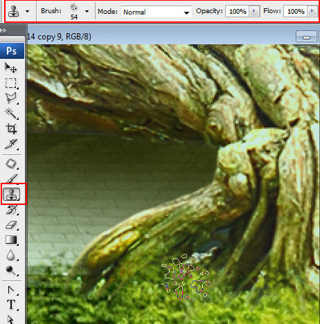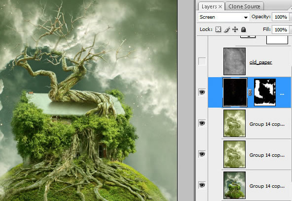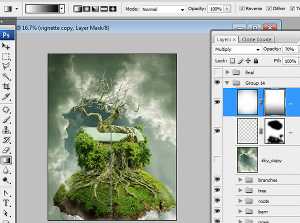 润饰合并的图层。使用图章工具遮掉那些组成合成物不同细节间的杂乱地区以及边缘。为了使树枝和绿色的树叶之间的杂乱地区变得平滑些可以将有纹理的笔刷用于图章工具中。按住Alt点击鼠标让定位器停留在绿叶上定位。然后添加一些克隆好的绿点在树枝上。重复几次这个动作使得那些粗糙的点全部被覆盖。你也可以使用这种手法去修饰和平滑天空跟老畜棚之间的叶子区域。