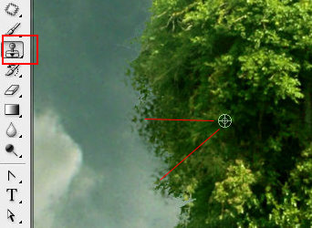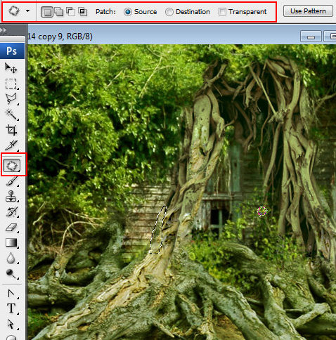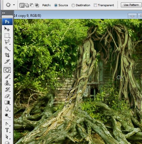 你也可以用修补工具区修复一些漏洞。拖曳选区一些边缘地区出来,并修补好不同石块间的潦草的东西。当你放开鼠标,你所选的区域就会被另一些你抽取像素所修复。