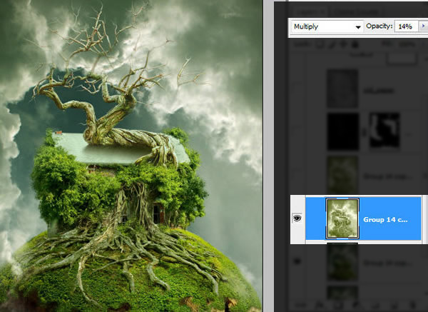 复制两次渐变映射过的图层。为最底下这层的图层混合模式设置为正片叠底,不透明度为14%,为最上面这层使用正常图层混合模式,不透明度设置为18%。