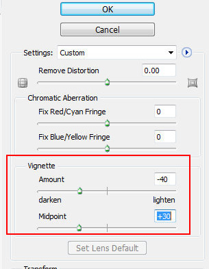 创建一个新的空白图层。执行 滤镜 > 镜头校正 ,更改”晕影”的参数。