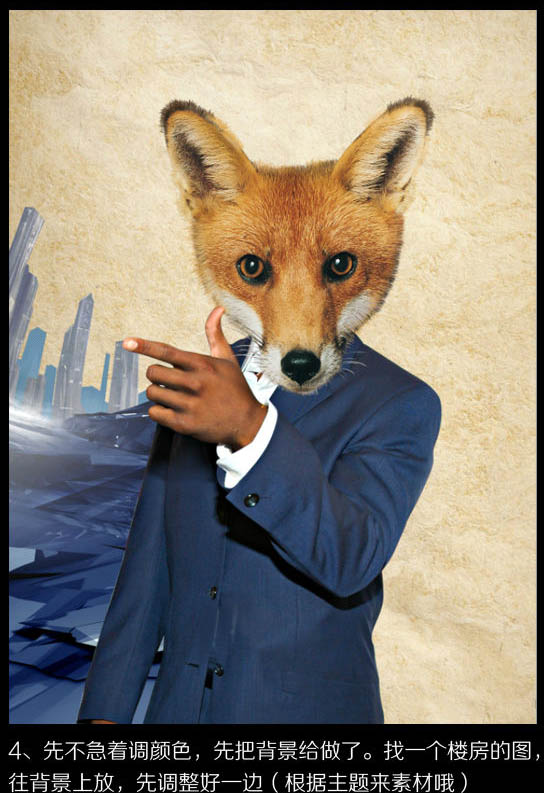 4、先不急着调色,把背景给做了。找一个楼房的图,往背景上放,先调整好一边。