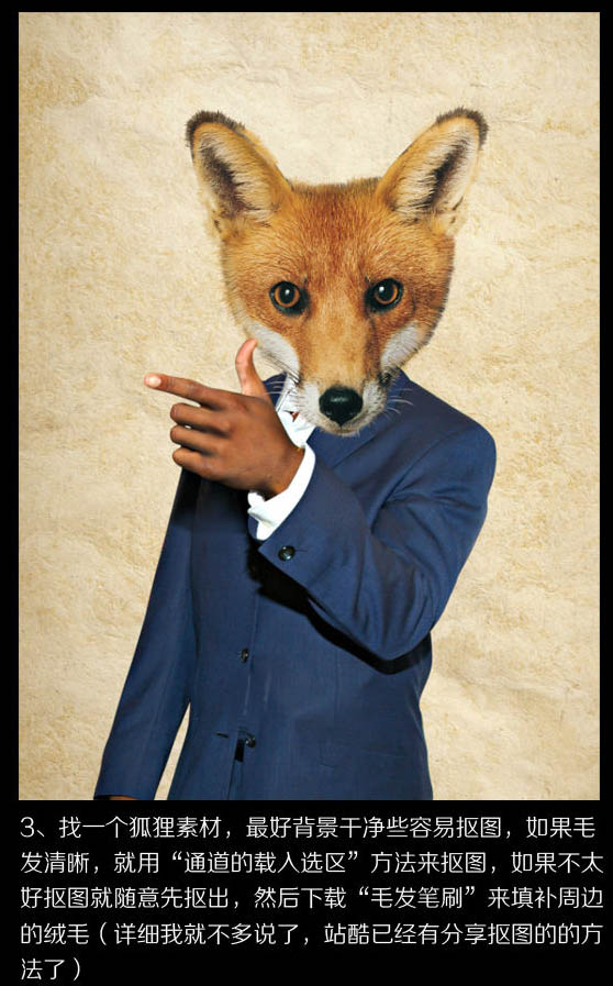 合成制作狐狸叫party海报2 3、找一个狐狸素材,最好背景干净些容易抠图,如果毛发清晰,就用通道载入选区方法来抠图,如果不太好抠图就随意先抠图,