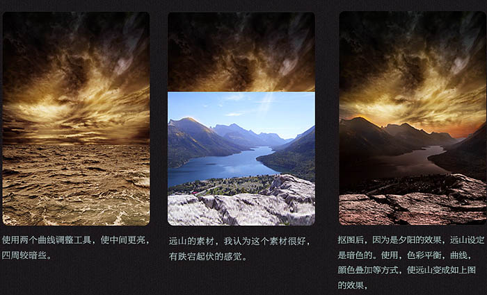 教程共分为两个大的部分:首先是前期的合成,把背景、人物、山脉等融合起来,并渲染好颜色。然后在底部加入文字,并添加质感及纹理。过程虽然不复杂,不过要处理的细节是非常