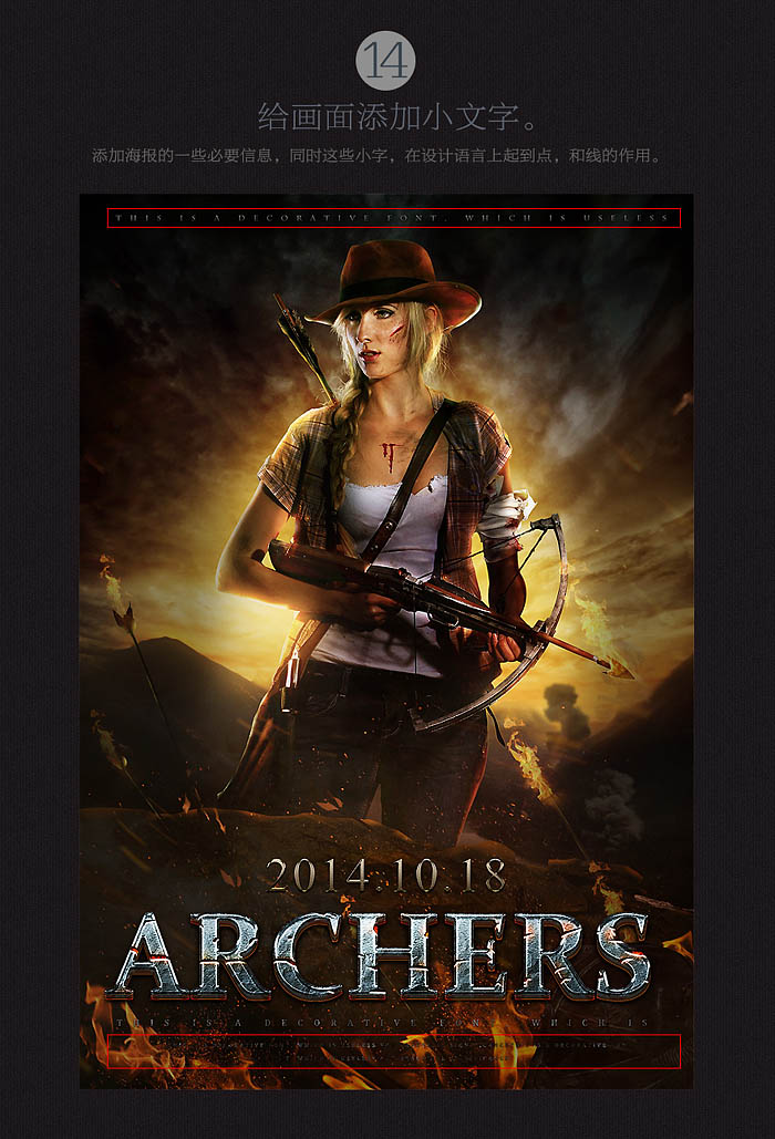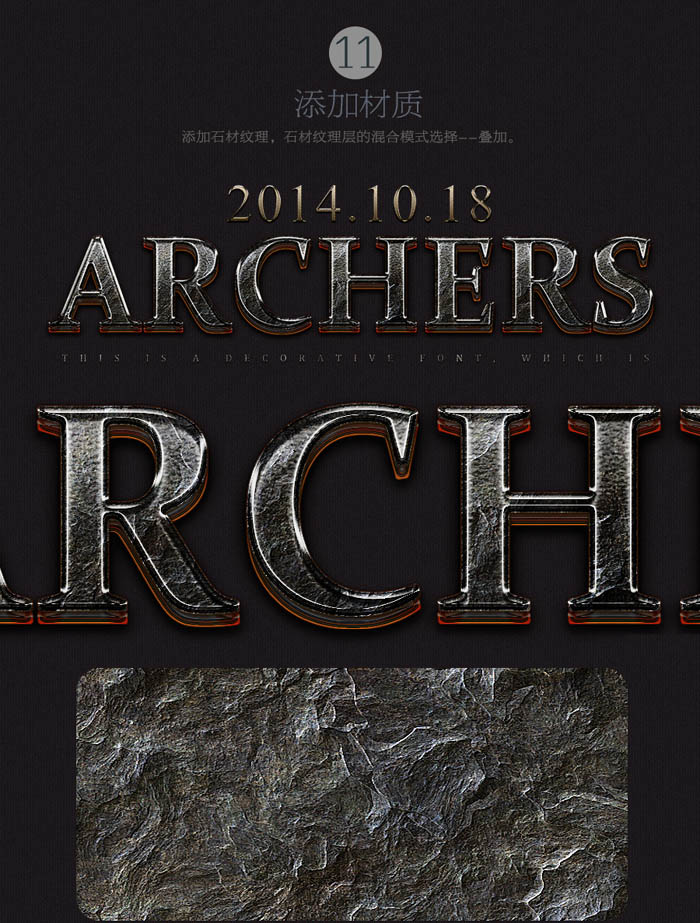 10、调整文字质感。 11、给文字添加材质。 点小图查看大图 12、微调文字细节。 13、给文字添加裂纹及火焰。 14、给画面添加小文字。 最终效果: