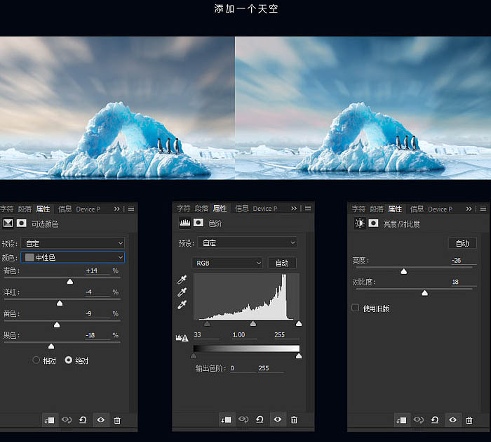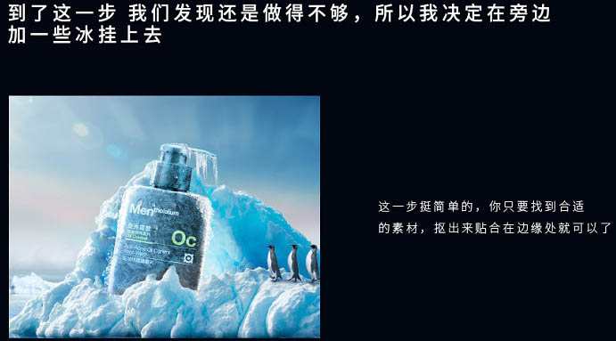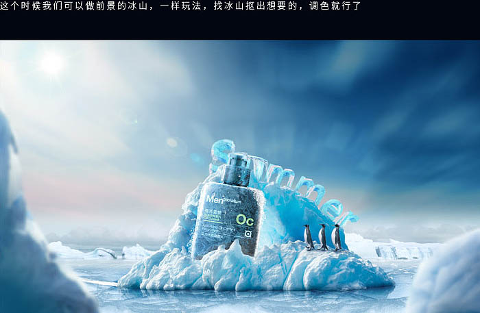 6、添加一个天空。 7、在海边左上角设定光源。 8、背景就基本完成了,现在我们把产品添加进去。 9、这个时候我们可以做前景的冰山。 最终效果: